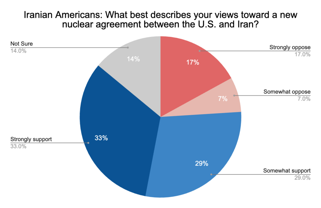 Finding 2: A strong majority of Iranian Americans supports a new agreement that guards against Iran securing nuclear weapons, 62% – 24%, with a plurality (33%) strongly supporting such an agreement.